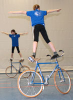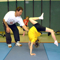 Wer sollte diese Aufgabe des Vermittelns übernehmen? Der Zufall kam ihm in meiner Person, eines Akrobatiktrainers, der Erfahrungen hatte mit dem Umgang von neuartigen Bewegungsformen (Einrad, Skateboard, Inline-Skating, etc.), zu Hilfe.