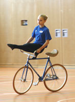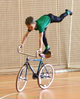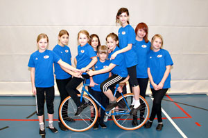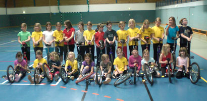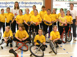 Durch diese Aktion lernten wir Märkisch Buchholz kennen, den Ort, an dem die Sportart "Kunstradfahren" seit Jahren trainiert wird. Obwohl es der Wunsch unserer Mädchen war auch Kunstradfahren zu erlernen, dauerte es noch einige Jahre bis die Situation reif war, dem Wunsche nachzukommen. Ausgeliehene Kunsträder (vielen Dank an Herrn Hemmerling) für ein Probetraining festigten die Meinung unserer jungen Eleven. Leichter gesagt als getan!