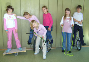 Schnell stellten sie fest, dass es nicht so einfach ist, wie es aussah. So trennte sich bald die "Spreu vom Weizen". Trotzdem wurde von vielen Mädchen (Jungen zeigten zu wenig Ausdauer) das Lernziel Einradfahren verfolgt und auch erreicht.